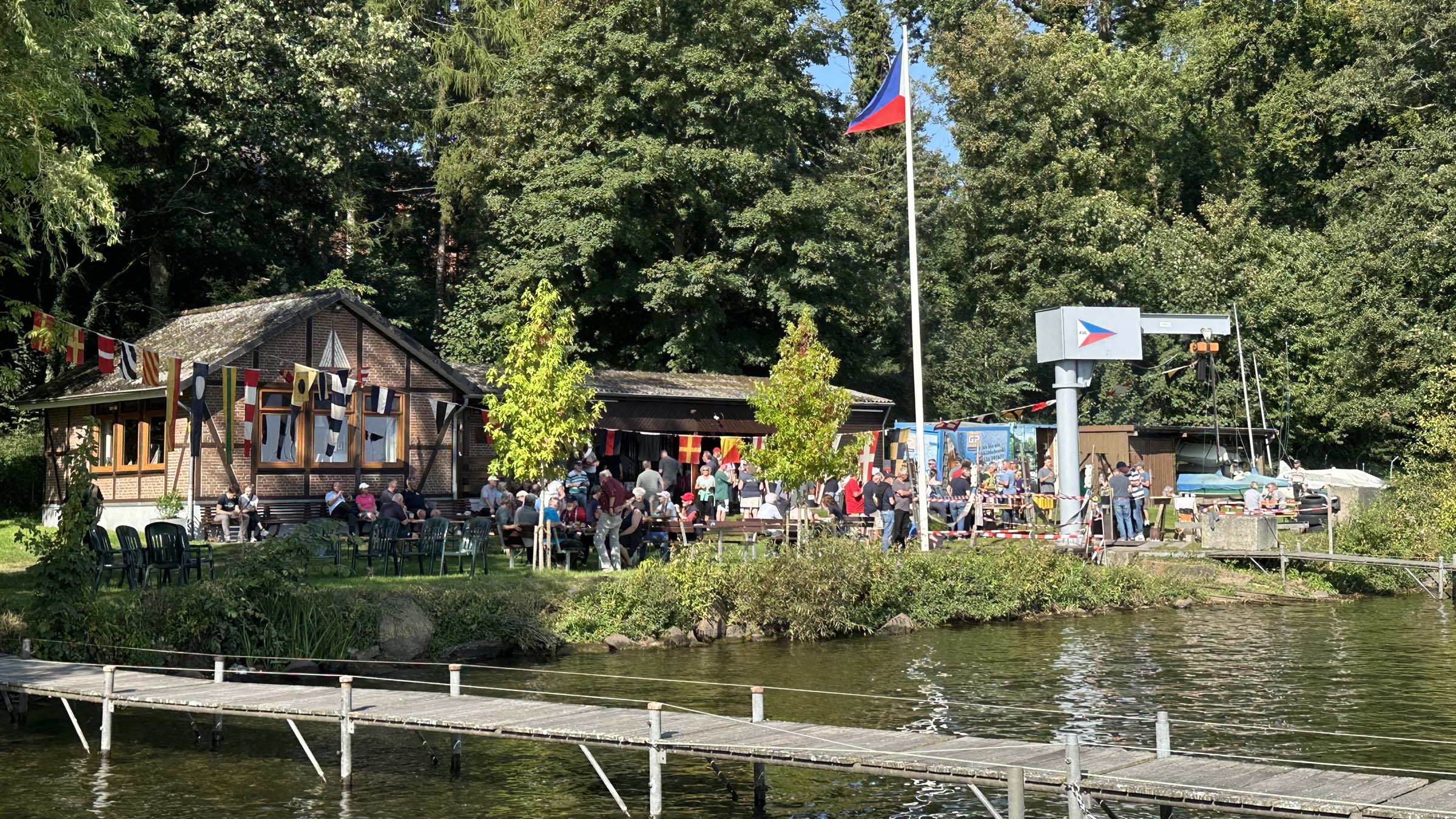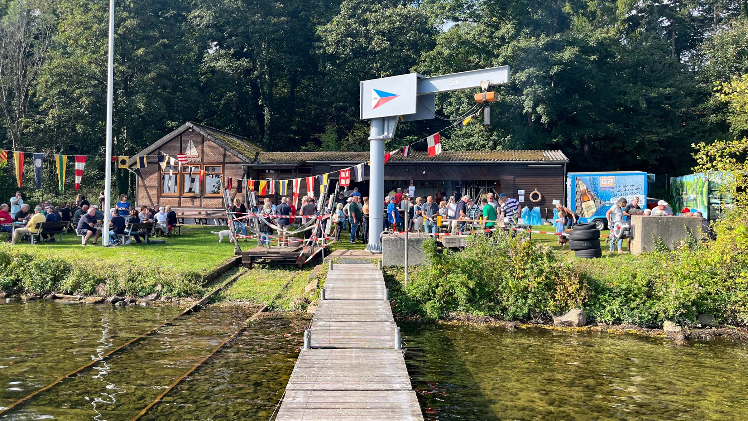 Absegeln 2025 am 20. September 2025. Sonnenaufgang über dem Plöner See. Im Vordergrund das festlich geschmückte Vereinsgelände der Ascheberger Seglergemeinschaft.