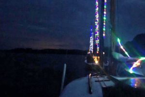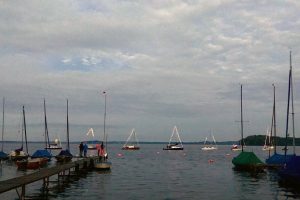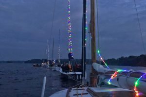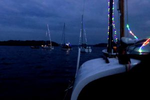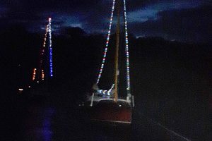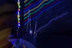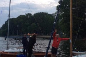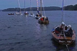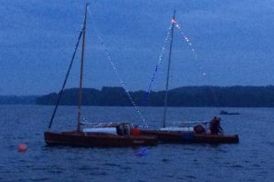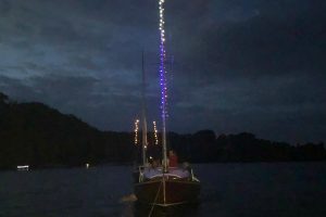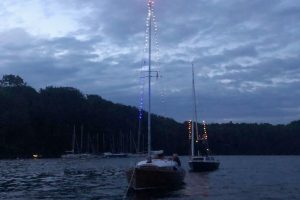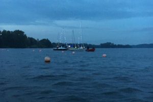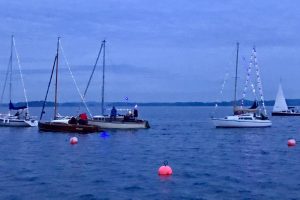 Immer wieder wurden Blicke auf die Wetterapps und Regenradars geworfen. Um 20:00 Uhr stand der Beschluss fest: Segeln ist ein Wassersport und Segler seien auch Regen gewohnt. Schnell wurden die Boote geschmückt und um 21:00 Uhr die Leinen los geworfen. Jürgen und Sven im Herkules zogen sieben vollbesetzte Boote bei zunehmender Dunkelheit durch die Ascheberger Bucht.